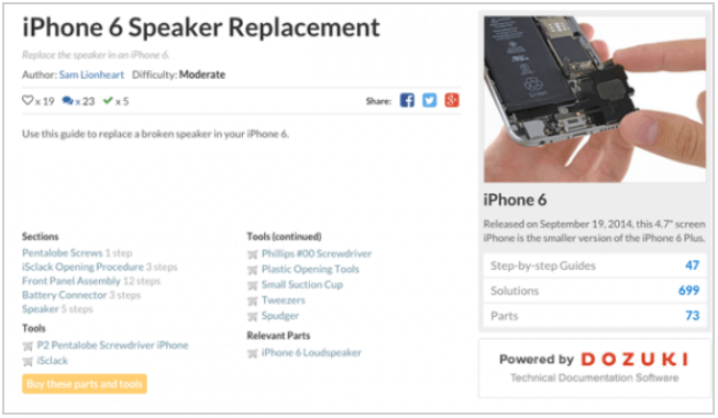 وب سایت ifixit یک فروشگاه ابزار و اجزای الکترونیک است که دستورالعمل های تعمیر بصورت دستی را مرحله به مرحله در اختیار کاربران قرار میدهد. بعنوان مثال در تصویر زیر مراحل تعویض اسپیکر آیفون 6 را مشاهده میکنید.